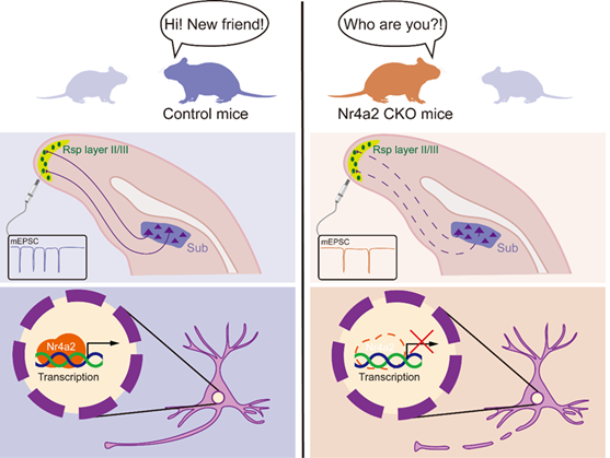 图:Nr4a2调控Sub神经元特化与社交新颖性的作用模型