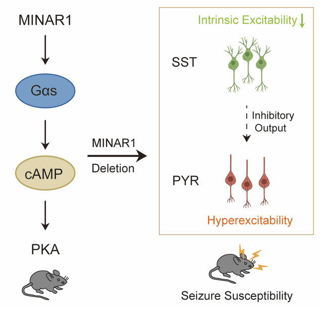 图片摘要:MINAR1在皮质生长抑素神经元兴奋性调控及调节癫痫易感性中的作用机制